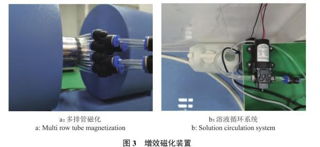 由于静态磁化单次最多磁化50 mL溶液,而单次喷雾雾滴粒径测试过程使用溶液量为1 L左右,因此,所有试验组使用的溶液均参照常规方式以一定流速通过磁场进行磁化。为增加磁化效果,使用多排管和循环磁化方式对溶液进行增效磁化,为避免雾滴粒径测试过程中出现溶液量不足的现象,设定单次循环磁化溶液量为3 L,增效磁化装置如图3所示。磁化除草剂雾滴粒径试验设计同表1,循环磁化时长与静态磁化时长对应一致,对照组与试验组共48组试验。处理1不进行磁化处理,用雾滴粒径仪重复测3次取平均值,为122.47μm,当作对照值,试验中以体积中值直径(Volume median diameter,VMD)表示雾滴直径。处理2设置磁场强度为50 mT,循环磁化完毕后立即用激光粒度仪测磁化后溶液喷雾雾滴粒径并记录数据。之后每个处理磁场强度递增50 mT,操作步骤参照处理2进行。磁化溶液雾滴粒径测试系统如图4所示。