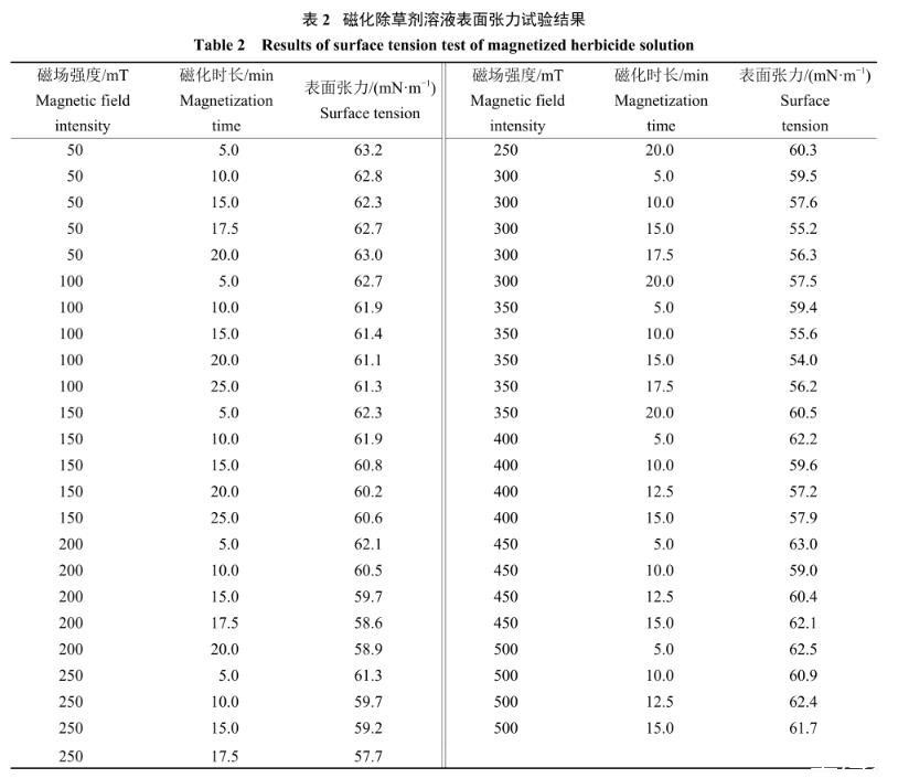 磁场强度和磁化时长对除草剂溶液表面张力、喷雾雾滴粒径的影响(二)