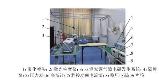 喷施压力是影响喷雾雾滴粒径的关键因素,试验中通过手动调整隔膜泵调压螺丝,设定喷施压力为0.3 MPa,使用稳压电源供给隔膜泵稳定的12 V额定工作电压,确保所有试验组喷施压力一致;扇形喷面不同位置的雾滴粒径也有较大差别,所有试验组雾滴粒径测试点设定为扇形喷面对称中心线上距离喷头40 cm处。试验环境温度保持为26℃,喷施系统管长(磁极至雾化喷头水管长度)设为1 m,按照除草剂与自来水1∶300的体积比配置试验溶液。