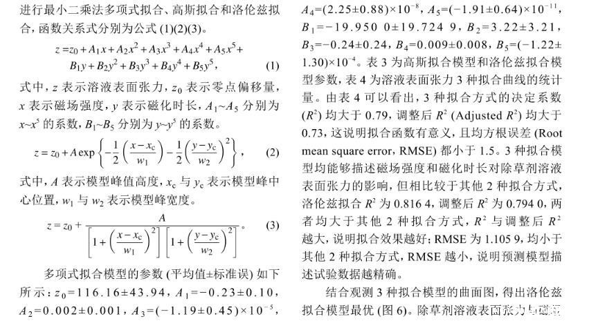 结合观测3种拟合模型的曲面图,得出洛伦兹拟合模型最优(图6)。除草剂溶液表面张力与磁场强度和磁化时长的关系式见公式(4),为研究磁化作用对除草剂溶液表面张力的影响提供理论参考。