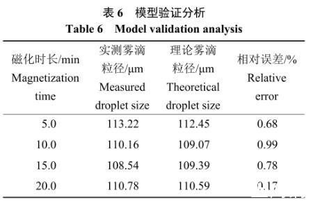 为验证350 mT磁场强度时雾滴粒径调控模型的实际应用价值,参考磁化除草剂溶液雾滴粒径的试验设计,在磁场强度为350 mT前提下,对除草剂溶液分别循环磁化5.0、10.0、15.0、20.0 min,实测雾滴粒径与模型理论雾滴粒径见表6,经过分析,实测值与理论值相对误差均小于1%,此模型具有实际应用价值。