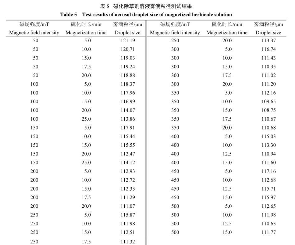 喷施压力、喷头型号、磁化溶液量等多种因素都可能对磁化效果产生影响,在后续研究中应尽可能建立有多影响因素参数的函数关系式;除此之外,磁化作用通过影响除草剂溶液表面张力而间接影响雾滴粒径,可通过研究表面张力与雾滴粒径关系模型来优化磁化作用与雾滴粒径的函数关系式。