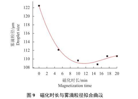 1)在0~500 mT磁场强度范围内,当磁场强度为350 mT、磁化时间为15.0 min时,表面张力最小,为54.0 mN/m,下降14.96%;喷雾雾滴粒径最小,为108.75μm,下降11.20%。溶液表面张力和喷雾雾滴粒径随磁场强度和磁化时长的增加均呈现先下降后回升的趋势,表明只有在特定磁场强度和磁化时长范围内磁化效果才最佳。