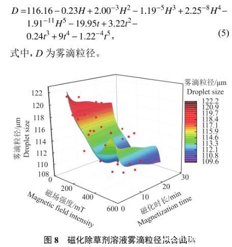 2)对磁化除草剂溶液表面张力和喷雾雾滴粒径进行拟合处理,洛伦兹拟合模型最符合除草剂溶液表面张力受磁场强度和磁化时长影响的变化规律,以洛伦兹模型函数作为表面张力与磁场强度和磁化时长的函数关系式;多项式拟合模型能有效描述除草剂溶液喷雾雾滴粒径受磁场强度和磁化时长影响的变化规律,以固定磁场强度调整磁化时长的方法给出了350 mT磁场下调控喷雾滴粒径的函数关系式。