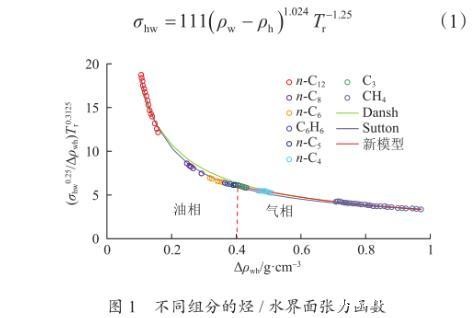 Firoozabadi于1988年首次根据实验测量的甲烷(CH4)、丙烷(C3H8)、正丁烷(n-C4)、正戊烷(n-C5)、正己烷(n-C6)、苯(C6H6)、正辛烷(n-C8)和正十二烷(n-C12)的数据,认为烃与水之间的界面张力、拟对比温度和烃水密度差满足一定关系,以烃水密度差Δρwh为横坐标,函数(σhw0.25/Δρwh)Tr0.3125为纵坐标,可以得到不同组分的烃/水界面张力函数曲线,如图1所示。Danesh于1988年利用Firoozabadi提供的实验数据,回归出了界面张力经验公式为