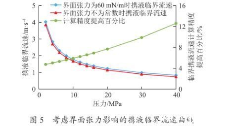 (1)界面张力对携液临界流量影响。如图5所示为气体相对密度为0.7,温度为100℃时,利用新模型计算当界面张力为常数(60 mN/m)和界面张力随压力变化时不同压力下的携液临界流速。考虑界面张力变化的携液临界流速要比界面张力为常数时的小,计算精度更高。且随着压力的增大,携液临界流速的计算精度提高百分比,逐渐从4%上升至12.5%,平均提高了8%。