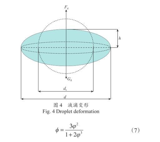 如图4所示,ds为球形液滴的直径,m;d为液滴变形后迎风面直径,m;h为椭球体短轴高度,m。液滴等效直径比φ为球形液滴直径与变形后迎风面直径比,即φ=ds/d。当液滴为椭球形时,其表面积近似为