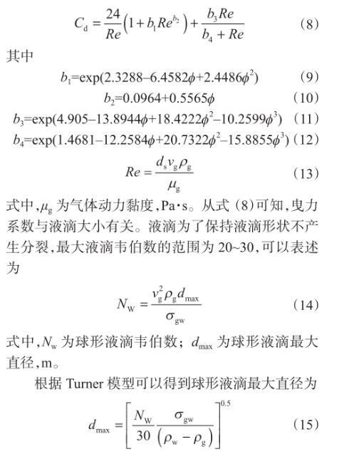 式中,φ为液滴变形程度系数,为与变形液滴体积相等的等效球形表面积与实际液滴表面积的比值。当气液相对速度不大时,液滴保持球形,可以利用球形液滴曳力系数计算携液临界流量,但是当液滴发生变形以后,曳力系数和液滴迎风面积相应的发生改变,用球形液滴曳力系数计算误差可能高达30%,对于非球形刚性颗粒,可以应用如下曳力系数表达式进行计算:
