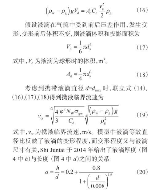 气体携液满足的基础力学条件为向上曳力等于液滴重力,即假设液滴在气流中受到前后压差作用,发生变形,变形前后体积不变,则液滴体积和投影面积为