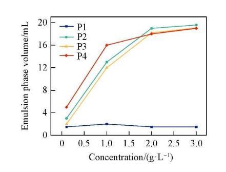 图7示出4种表面活性剂对液体石蜡的乳化能力随浓度的变化关系。P1由于较短的聚氧乙烯链段导致较差的亲水性和乳化能力。随着浓度的增加,P2,P3和P4的乳化性能逐渐提升,这是由于吸附在油/水界面上的表面活性剂分子数量随着浓度的增加而增多,使分子形成的聚集体在界面处排列得更紧密,生成更致密、更刚性的油/水界面膜,从而使乳状液也更加稳定。具有长聚氧乙烯链的表面活性剂乳化性能更好,这是因为聚氧乙烯链的空间排斥作用可以防止乳液液滴聚并,有利于稳定液滴。
