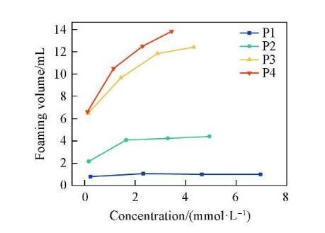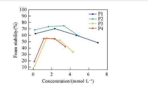 图6示出4种表面活性剂泡沫稳定性随浓度的变化情况。泡沫稳定性随着浓度的增加先升高至最大值后又降低。这是因为表面活性剂的吸附导致了Gibbs-Marangoni效应。当液膜受到冲击局部变薄时,产生表面张力梯度,导致邻近区域吸附的表面活性剂携带水化层向薄膜处迁移,以恢复原来的表面张力并修复液膜。在较低浓度时,表面活性剂浓度的增加使得Gibbs-Marangoni效应随之加强,进而有效阻止液膜变薄,增加泡沫的稳定性。当浓度大于cmc后,溶液中的表面活性剂分子能够快速吸附在界面处,使得Gibbs-Marangoni效应减弱,泡沫稳定性降低。在4种表面活性剂中,P2的泡沫稳定性最强,这可能是由于分子在空气/水界面上排列最紧密,形成的液膜强度更大,因此泡沫不易发生破裂。