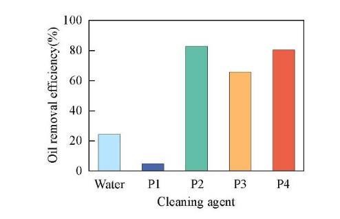为探究表面活性剂在清洗领域的应用,测试了4种表面活性剂对油污的去除能力。在超声清洗之前,油污的质量为41 mg.超声清洗后,去离子水除去10 mg油污,去污效率为24.4%;P1由于溶解性差,在水溶液中大部分都不能溶解,导致去污效率很差,仅为4.9%;P2,P3和P4分别除去34,27和33 mg油污,去污效率分别达到82.9%,65.8%和80.5%,远远高于去离子水的去污效率(图9)。因此,P2,P3和P4表面活性剂有着良好的去污性能,进一步说明其在清洗领域有巨大的应用潜力。