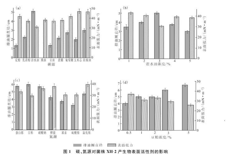 图1碳、氮源对菌株XH-2产生物表面活性剂的影响