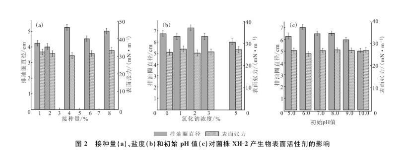 图2接种量(a)、盐度(b)和初始pH值(c)对菌株XH-2产生物表面活性剂的影响