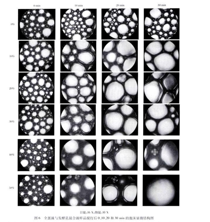 目镜:16 X;物镜:10 X图6全蛋液与发酵乳混合液样品搅打后0、10、20和30 min的泡沫显微结构图