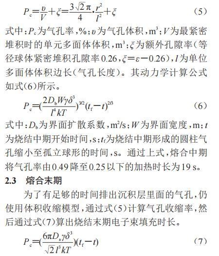 为了有足够的时间排出沉积层里面的气孔,仍使用体积收缩模型,通过式(5)计算气孔收缩率,然后通过式(7)算出烧结末期电子束填充时长。