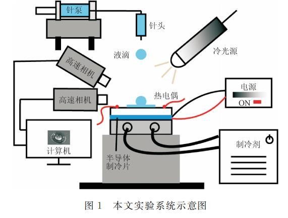 液滴冲击的水平壁面为硅片(亲水光滑硅片),乙醇液滴在该水平壁面上的静态接触角为8.5°。硅片紧密贴合于一半导体制冷片的冷端,半导体制冷片的热端与循环制冷机(JULABO,CD-300F)的冷却模块贴合,通过这种方式,硅片的温度Ts的范围为0~-36℃。水平壁面温度为硅片两个对称布置的K型热电偶(Omega,精度为±0.1K)的测量值的平均值。环境温度为(20±1)℃,相对湿度为(35±2)%。为了尽量消除过冷表面结霜对表面粗糙度的影响,每次实验前利用无纺布沿同一方向对实验水平壁面进行擦拭。为确保实验数据的可靠性,每组实验至少重复3次,对重复的结果进行计算,所获得的标准方差为误差棒。