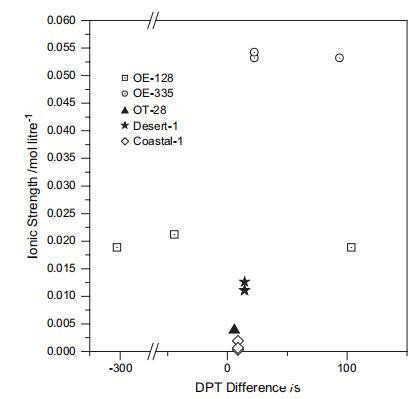 对于五种测试土壤中的四种,盐中的无机盐 溶液和土壤提取物似乎有助于增加 在 DPT 中与纯水相比(图 3、4)。 盐可以 通过离子-水相互作用可能会影响液滴渗透时间,从而导致附近水的强静电排序 分子。 然而,我们发现两者之间没有明显的关系 DPT 和溶液盐含量的增加(表示为离子 图 5 中的强度)。 另一种可能性是盐会影响 结合的有机物分子的构型是 负责排斥,导致 DPT 增加。 这些 推测需要进一步测试,目前正在接受 调查。