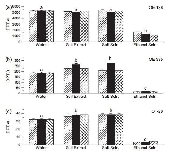 水滴渗透时间 (DPT)、1:1 土壤提取物、盐 五种测试土壤上的溶液和乙醇溶液显示在 图 3. 可以看出 1:1 土壤提取物的 DPT (5 分钟、2 小时和 24 小时摘录)等于或大于 比所有土壤的水 DPT。 还看到盐 溶液(相同的 EC 和相同的单价/二价阳离子比例 土壤提取物,但其 γLV 与水相似)具有 基本上与土壤提取物相同的 DPT。 然而,DPTs 与 γLV 和盐含量相同的乙醇溶液 土壤提取物显着低于土壤的 DPT 提取物、盐溶液和水(图 3)。