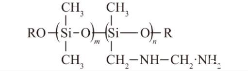 用电子天平称取一定量的氨基酸和异丙醇并将二者搅拌混合在一起;将混合物加入到硅油化合物中,在氮气的保护下,搅拌升温至70℃,反应时间为5 h;最后进行减压蒸除溶剂,得到改性后的氨基改性硅油。氨基改性硅油是一种有机硅聚合物,通过将含有氨基的有机化合物与含有硅键的有机硅化合物反应而得到。在反应过程中,氨基与硅烷发生缩合反应,生成氨基改性的有机硅油化合物。结构式如图1所示。