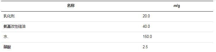 氨基改性硅油在未经乳化处理之前,通常为一种油状或半固态的物质,不易与水相混合。而氨基改性硅油柔软剂需要在水中分散均匀,才能被纺织物充分吸收和利用,发挥柔软、抗静电等作用。因此,上述步骤下制得的氨基改性硅油还需要进一步的乳化处理,才能形成氨基改性硅油柔软剂,否则不能发挥柔软剂的作用,反而还会损伤纺织物。室温下,将乳化剂、氨基改性硅油、醋酸与水按照一定的比例混合,然后200 r/min搅拌5 min,即可制成氨基改性硅油柔软剂。乳化方案中各物质比例见表1。
