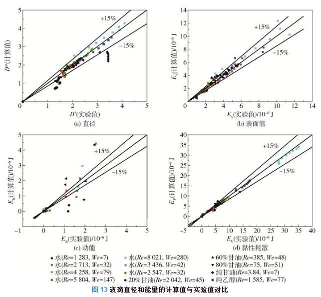 图13为液滴直径和能量的计算值与实验值对比。可以看出,液滴直径的计算值和实验值的平均误差约为15%(图13(a)),液滴表面能的计算值和实验值的平均误差约为15%(图13(b)),液滴动能的计算值和实验值的误差较大,最大误差约为50%(图13(c)),液滴黏性耗散的计算值和实验值的误差小于15%(图13(d))。