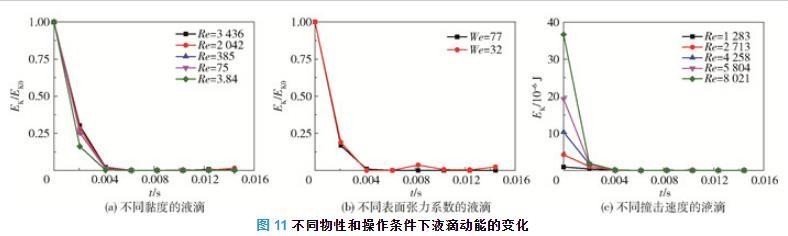 图11(b)为水和乙醇液滴在撞击过程中动能随时间的变化。可以看出,液滴在铺展过程中动能的减小量和减小的速率不随表面张力系数而变化。