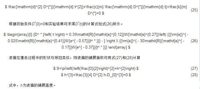 (2)在75 < Re < 9000,7 < We < 300时,可使用关系式Dmax*=We14和Smax*=0.203Re0.064We0.43分别预测液滴的最大铺展直径和最大铺展面积。