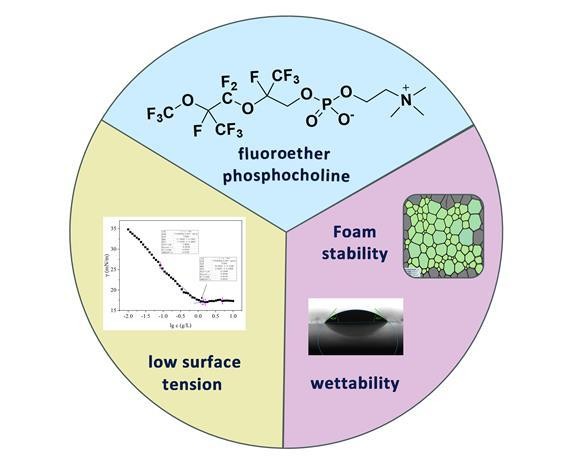 将氧原子引入到氟磷酸胆碱表面活性剂中,会对磷酸胆碱性能产生怎样的影响呢?我们设计合成了一种新型氟醚磷酸胆碱表面活性剂(图1b),考虑到长氟碳链和长氟醚链段具有生物累积性,我们选用了氟碳链为6的短链结构,并向其中插入两个氧原子,将新化合物与一个链长相近的氟磷酸胆碱表面活性剂进行对比,结果表明新型氟醚磷酸胆碱表面活性更佳。我们进一步探索了新氟醚磷酸胆碱的泡沫性能与润湿性能,结果表明氟醚磷酸胆碱的稳泡性好、可在聚四氟乙烯(PTFE)上润湿,是一类具有良好应用前景的表面活性剂。