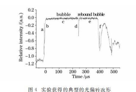 图3给出了探测光经过脉动空泡的示意图,图中空泡脉动特性曲线是基于空泡半径随时间变化的数值模拟得到的。图4即为由探测装置图2(a)获得的对应的典型光偏转信号波形图,它包含了激光作用于水中靶材时的三种物理现象和过程,即激光等离子体冲击波、等离子体空泡及其反弹现象、空泡溃灭冲击波。图中峰a为激光等离子体冲击波;c为等离子体空泡信号;e为空泡反弹信号;f为空泡收缩到最小泡体积时辐射的冲击波信号;b为空泡膨胀壁;d为空泡收缩壁。
