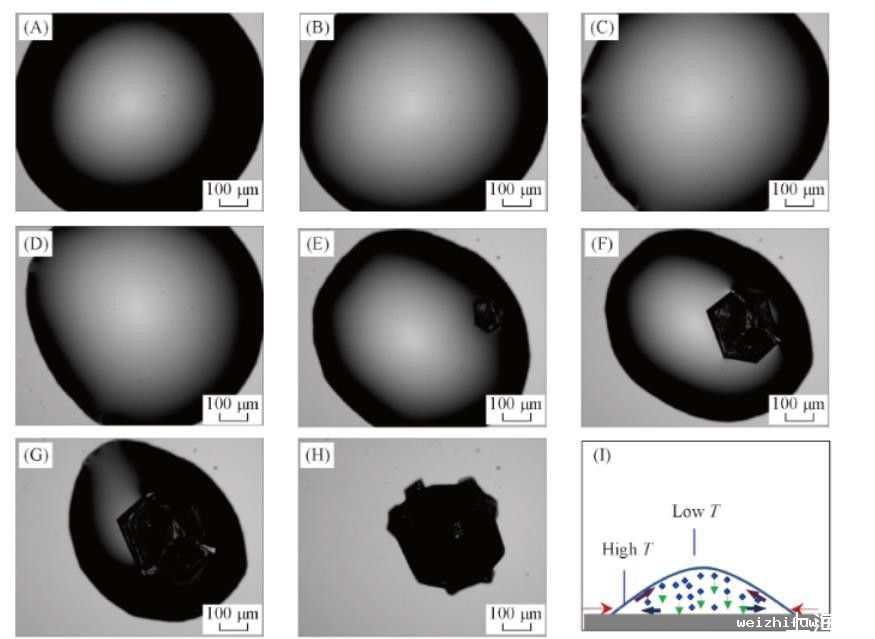 实验发现,纯水液滴和NaCl水溶液液滴在玻璃基底上蒸发时其三相接触线均发生不同程度的收缩。图1所示为NaCl溶液液滴的蒸发过程。可以看出,接触线的收缩并非连续不断,而是在一定时间内先保持“钉扎”[图1(A),(B)].在此过程中,接触角不断减小,从而使得表面张力的水平分力增大,当其超越基底对接触线产生钉扎作用时,就会引起接触线的收缩。由于基底结构的不均匀性,液滴各方向的收缩也可能是不均匀的,如图1(C)——(H)所示。由于蒸发过程中接触线不能钉扎,蒸发造成的Marangoni对流以及重力沉降作用使得NaCl在液滴中心区域富集,如图1(I)所示。因而NaCl晶体首先在液滴中心区域析出。