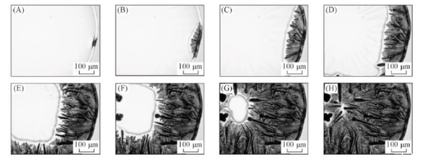 当液滴中NaCl含量较高时,盐并不是在液滴的边缘析出,而是在靠近边缘的位置析出。这可能是液滴蒸发初期毛细补偿流与Marangoni对流的竞争使得溶质在近边缘位置富集所致。此时,液滴边缘已成为凝胶区(表面张力小),而内部仍为液态区,因而析出的NaCl晶体将在内部液相表面张力的牵引下向内部运动,并逐渐形成更大尺寸的块状盐晶体。说明当NaCl浓度较高时,即使存在PTFE颗粒,仍有部分NaCl会按其自身生长特性形成多面体结构。而液滴边缘凝胶区枝晶的生长则与图2相类似,呈现出NaCl与胶体颗粒之间复杂耦合的特点。