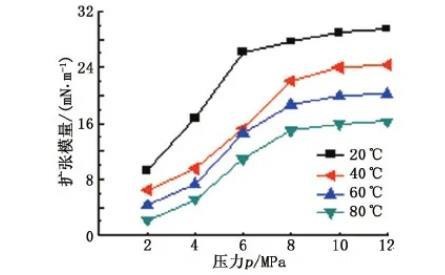 (2)温度对界面黏弹性的影响。从图7也可得出温度对CO2-AOT水溶液体系扩张模量的影响规律。CO2-AOT水溶液体系的扩张模量随着温度的升高逐渐降低,说明升高温度对体系界面黏弹性具有不利影响。其机制在于温度升高使得CO2对界面处AOT分子的吸引力减弱,不利于AOT分子在界面处的排列,也不利于AOT分子在界面处的吸附,从而导致界面扩张模量降低,界面膜的强度下降。