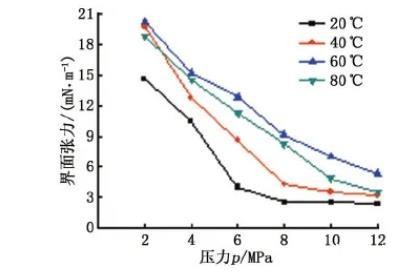(2)温度对界面张力的影响。温度对界面张力的影响见图6。可以看出,当体系压力一定,体系界面张力随着温度的升高而增大,说明温度的升高不利于体系界面张力的降低。原因在于CO2乳液是热力学不稳定体系,随着温度的升高,CO2本身的溶解度系数和密度均有所降低,分子热运动的加剧也不利于界面上AOT分子的吸附,导致界面处的AOT分子数目降低,最终导致体系界面张力升高。
