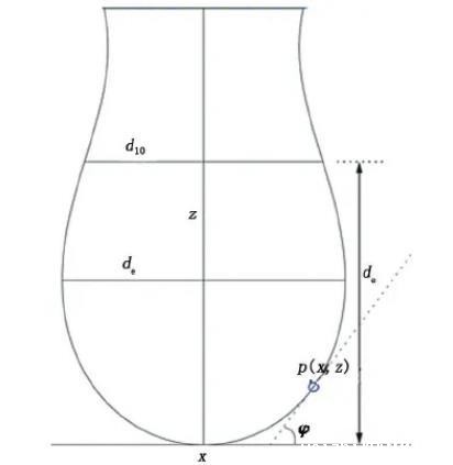悬滴法测定液体的表面和界面张力原理见图5。其中,de为悬滴最大直径;d10为离顶点距离为de处悬滴截面直径。