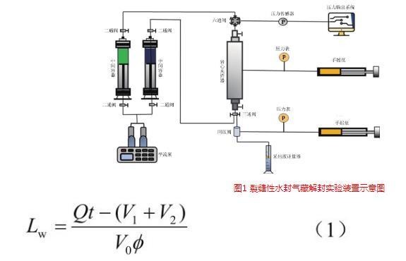 2)水封段塞制备及裂缝内压力控制。将岩心夹持器垂直放置(图1),使用驱替泵从岩心夹持器下端(出口端)低速注入不同长度的水段塞来模拟不同的水封程度,此时岩心出口端面与岩心夹持器堵头间形成的裂缝中也充满水。通过控制出口端压力(回压)可直接控制裂缝的压力,从而研究基质—裂缝间压差变化对解封过程的影响。水封段塞长度计算公式如下: