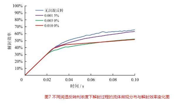 图7不同润湿反转剂浓度下解封过程的流体微观分布与解封效率变化图