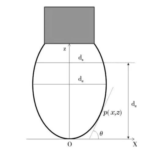 对于图1所示的液体悬滴,以悬滴顶点O为坐标原点,该点处的水平切线为x轴,悬滴轮廓的对称轴为z轴,建立平面直角坐标系。设悬滴轮廓上任意一点p的坐标为(x,z),p点处切线与x轴的夹角为θ。