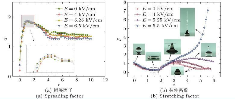 图3不同场强下液滴无量纲因子随无量纲时间变化(We=17.8)