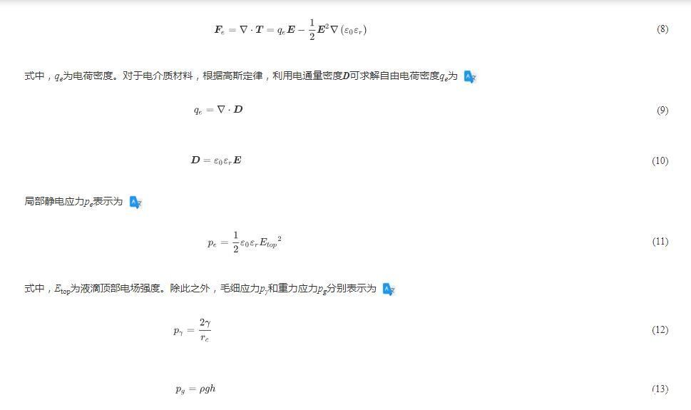 液滴在撞击过程中受惯性力、重力、表面张力、静电力和粘滞力的共同影响。铺展阶段,惯性力占主导作用。而在拉伸阶段,惯性力和静电力促进液滴的拉伸,重力、表面张力和粘滞耗散抑制液滴拉伸,在力的共同作用下产生了图2的不同拉伸模态。在此过程中,由于电场是垂直方向,液滴的模态演化主要受到垂直方向力的影响,而水平方向受力作用较小,因此在后续分析中,我们假设水平方向受力变化对液滴形态的影响忽略不计,将重点分析垂直方向的受力情况,以此探讨不同拉伸模态的机理。