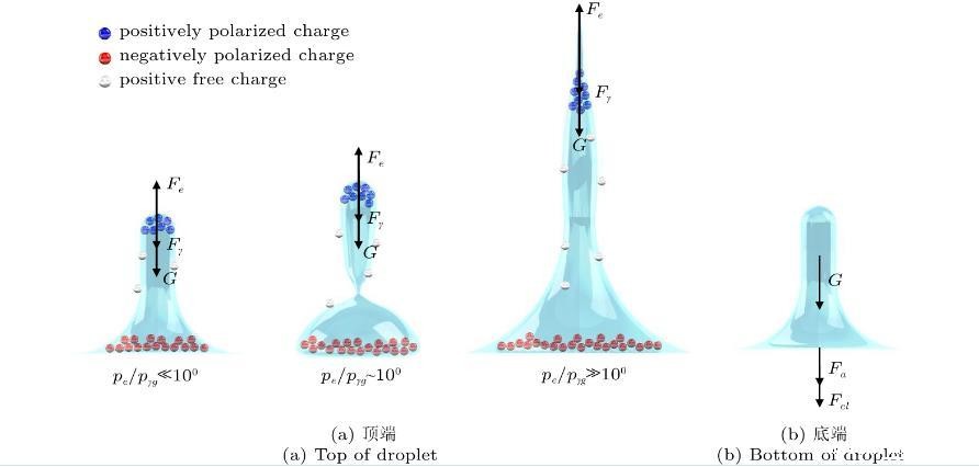 除此之外,液滴底部在不同模式下的动力学行为相同,如图4(b)所示。液滴底部会被诱导负电荷,此时其受到垂直向下的静电力Fel,静电力和粘附力Fa同时作用于液滴的底部,因此它们既不促进也不阻碍液滴的拉伸,其作用本质是使液滴附着在下极板上,防止其反弹。