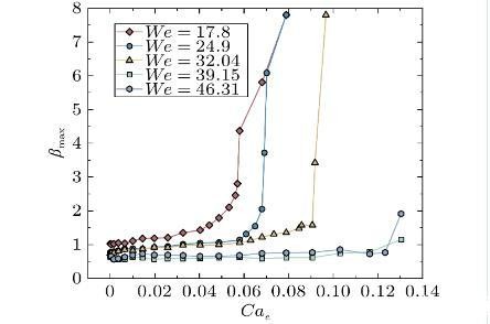 图6描述了不同韦伯数下液滴最大无量纲拉伸系数βmax的对比趋势。最大拉伸系数值是在式(5)的基础上求取:βmax=Hmax/D0,其中Hmax为液滴在撞击过程中达到的最大拉伸高度。可以发现,当实验条件设定为低韦伯数和高电毛细数时,液滴的最大拉伸系数明显增大,甚至在此条件下部分液滴产生了射流模态,所形成的液丝长度超出了上极板的界限。除此之外,前三组韦伯数下的液滴撞击实验结果分析,得到结论:韦伯数的增大,直接导致液滴达到喷射状态所需的电毛细数相对应增大。