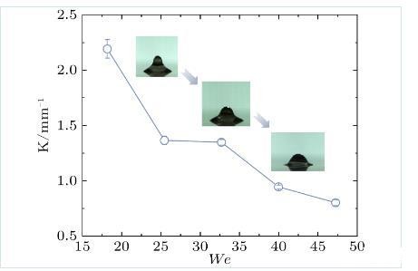 为了更加清晰地表明液滴撞击的We对三种模态的影响,根据实验结果总结了撞击We与电毛细力Cae的关系,如图7所示。函数结果表明,第一模态可以发生在所有韦伯数内,并且随着韦伯数的增加,第一模态的阈值电场也在不断增加。第二模态的阈值电场范围是三种模态中最小的,韦伯数越大时需要更强的电场才能产生第二模态。第三模态的阈值电场随着韦伯数的增加也在不断增大,只是液滴出现第三模态的电场范围在减小。这可能是由于韦伯数的变化导致拉伸液滴形态的变化,从而影响了静电力的强度。基于上述考虑,为了深入剖析三种模态阈值电场变化的原因,根据实验结果对无外加电场条件下液滴拉伸过程中韦伯数We与平均顶点曲率K(如式7所示)的关系进行了讨论,如图8所示。从关系图中可以看出,当液滴处于回缩阶段并达到最大拉伸高度时,韦伯数的增加会伴随着液滴顶部曲率半径的增大,而曲率半径的增大将会导致静电力的相对减弱。
