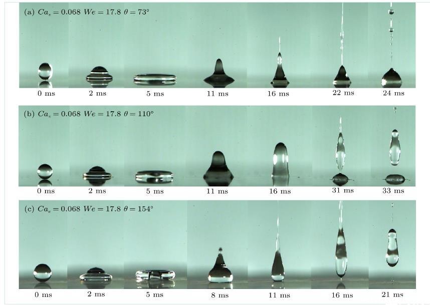 图9液滴撞击亲水、疏水以及超疏水表面的过程图
