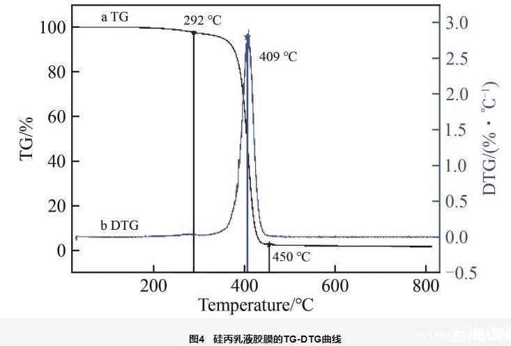 从图4可以看出,胶膜失重分为3个阶段:在292℃前,失重2.54%,此时失去的是胶膜中的水及小分子物质的挥发,胶膜并未发生分解;293~450℃之间为共聚物的热分解阶段,该范围失重95.30%,且分解速度较快,主要是Si—O、C—C、C—O和C—H键的断裂所致;450~800℃之间失重0.43%,这是共聚物分子链的断裂和分解,分解速度较为缓慢;800℃基本分解完全,仅剩下1.73%的灰分,证明硅丙乳液胶膜具有良好的耐热性。由DTG曲线可以看出,409℃热分解速率最大,说明硅丙乳液具有良好的热稳定性,这是因为在共聚物分子中引入了具有较高键能的Si—O—Si键的结果。