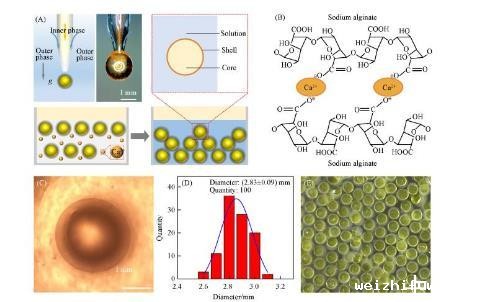 为了实现一步法制备大小均匀、尺寸可控、壁厚可调、生物相容的水/水微囊,需要设计同轴微流控器件,如图1(A)所示。内相黄原胶水溶液由内管注入微流控器件;外相海藻酸钠水溶液,由外管注入微流控器件。内相在外相的剪切下形成液滴,同时外相在重力作用下脱离管口生成水包水的水/水微囊,并进一步通过钙离子交联海藻酸钠水凝胶网络,如图1(B)所示。由于微流控器件对内外相的精准调控,水/水微囊在光学显微镜下具有清晰稳定的核壳结构图1(C),平均尺寸(D)为(2.83±0.09)mm图1(D)。该方法制备水/水微囊具有器件结构简单、操作便捷、一步法成型、微囊尺寸均一可控、核壳结构稳定、无需后处理等优点图1(E)。