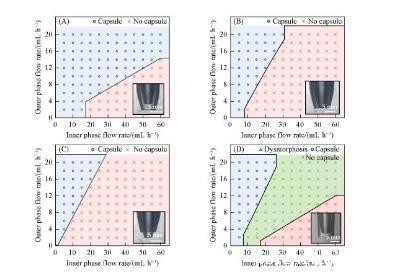 为了深入研究微流控器件结构对水/水微囊成型过程的影响规律,分别制备了内管管口内缩、内外管管口平齐、内管管口伸出、内管管口内缩外管管口不拉伸等4种同轴微流控器件,并通过系统改变内相和外相流速,判断水/水微囊的成型情况,最终确定水/水微囊的制备相图,分别如图2(A)——(D)所示。水/水微囊形成的关键是内相在外相的剪切下形成液滴,同时外相在重力作用下脱离管口生成水/水微囊。由于内外相均是水溶液,内相/外相界面张力较小,并且流体黏度较大,内相不容易在外相的剪切下形成液滴,进而被外相包裹形成水/水微囊,因此外相流速增大,对内相剪切加强,更易形成水/水微囊。