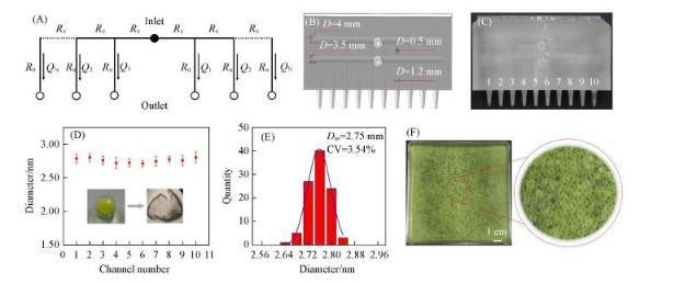 在确定平行放大微流控器件通道结构尺寸设计后,通过SolidWorks建立三维模型,并利用光固化3D打印机直接打印微流控器件。实验表明,10个并排微流控通道均可以稳定生成水/水微囊,并且所生成的微囊具有较一致的尺寸大小和较均匀的分散性。综合统计10个微流控通道形成的微囊分布,可以得到D=(2.75±0.10)mm.在10个平行微流控通道设计下,水/水微囊的产率可以达到0.5 kg/h,并可依据相同原理,进一步增加平行通道的数量,提高产率,实现尺寸均一水/水微囊的高通量制备。