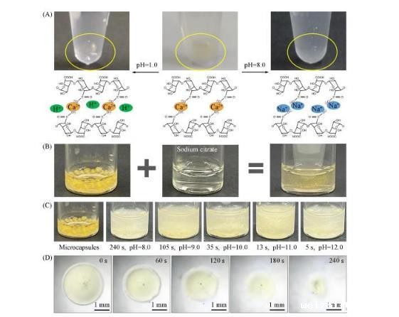 所制备的水/水微囊具有良好的生物相容性、尺寸均一性及较高的包裹率和装载率,是各种活性物质的理想载体,并且能够对pH变化做出响应,实现可控释放。如图5(A)所示,水/水微囊的壳层是由二价钙离子交联的海藻酸钠水凝胶组成,在酸性环境下具有良好的稳定性,但在碱性环境下海藻酸钠水凝胶与二价钙离子的结合能力变弱,交联网络被破坏,从而释放内核活性物质。如果在溶液中加入柠檬酸钠,二价钙离子更倾向于与柠檬酸根结合,从而破坏交联网络,也可以溶解水/水微囊。如图5(C)所示,水/水微囊的溶解速率随pH的增大而提高。当水/水微囊的囊壁被溶解后,内核物质逐渐被释放出来,展现出良好的pH响应性和可控释放。
