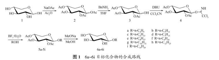 糖类化合物及其衍生物不仅为生物体的生命活动提供必要的能量,而且在核酸、蛋白质、糖类化合物、脂质四大类生命分子中地位独特,起着联系核酸、蛋白质和脂质生物分子的枢纽作用。糖类化合物作为生物缀合物中结构各异的亲水性结构砌块,与蛋白质和脂类化合物等结合成糖蛋白和糖脂等影响着它们的折叠和功能响应。木糖是被子植物细胞壁成分中含量居第2的以木聚糖(xylan)方式存在的最丰富的糖。木聚糖属于杂多糖,由1,4-β-D-木糖残基组成主链,侧链上连有α-L-阿拉伯糖等,在农业残留物玉米的穗轴、棉籽壳等中质量分数较高,易于通过酸解法高效生产相应的木糖。糖类化合物廉价及丰富,羟基众多,具有优异的亲水性,通过结构改造,在其还原端与脂肪链的醇相连,形成高表面活性的双亲类型O-糖苷分子,符合表面活性剂的结构要求,从而可开发成糖苷类表面活性剂。由于这种糖苷所用的主要原料为糖类化合物和脂肪链的醇,具有可再生性,在结构生物学、医学、洗涤剂、环保等领域具有广阔的应用价值。